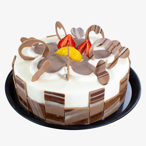 Pan de vainilla, pan de chocolate, crema de chocolate relleno de fresa y mil hojas