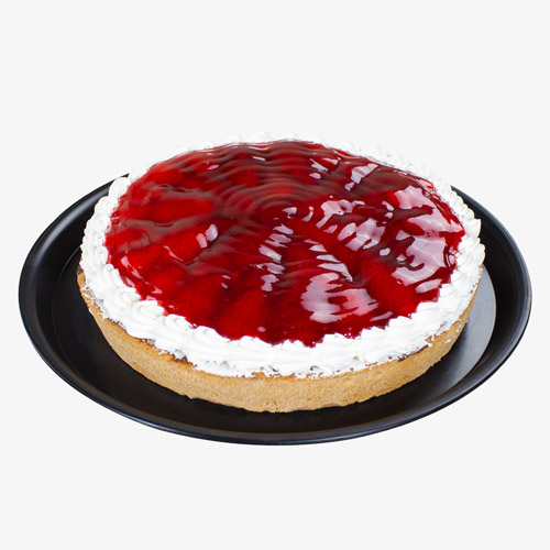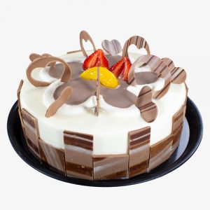 Mousse de durazno y mousse de fresa en la parte de en medio frutas mixtas base pan de vainilla